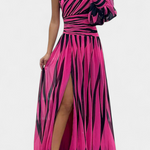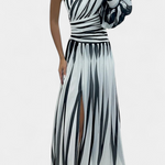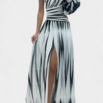 Детайли, които повишават вашия стил: Изряз с едно рамо, вертикални райета, флуиден макси крой, лек и удобен материал.