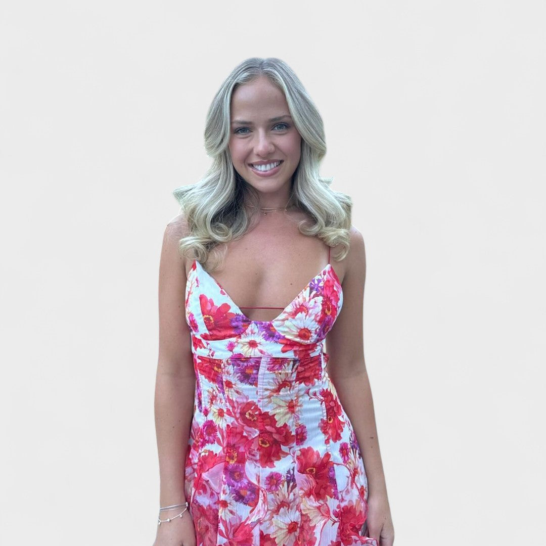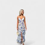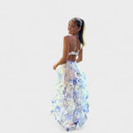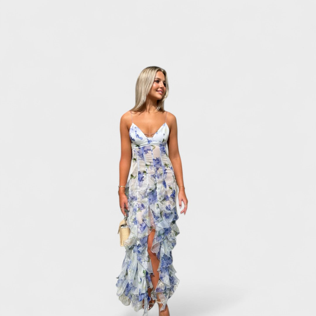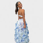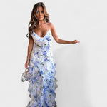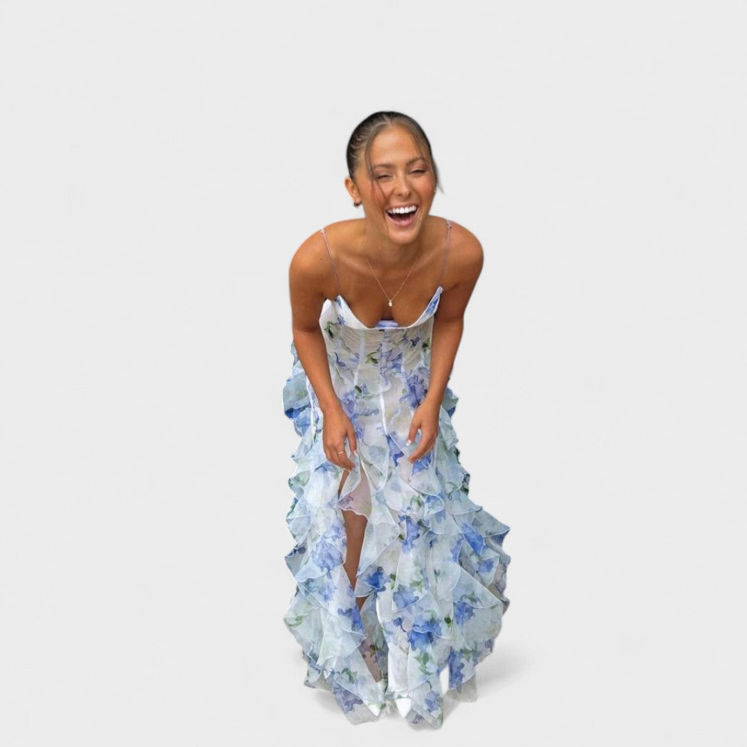 Тази дълга цветна рокля с волани внася нотка на изисканост и елегантност във всяка ситуация. Благодарение на женствеността си силует и разкошните детайли, тя предлага безупречен баланс между комфорт и блясък. Идеален е за тържествени поводи, празненства или оценени моменти, когато искате да блеснете.