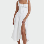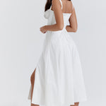 Лятна рокля с бюстие, която съчетава женственост и комфорт. Персонализираната кройка в горната част подчертава деколтето, докато летящата пола осигурява движение и свежест. Идеална за летни разходки, ваканции и елегантни ежедневни излизания.