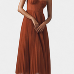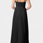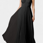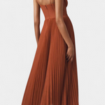 Роклята Нивес е олицетворение на структурирания романтизъм , със силует, който грациозно и присъствуващо тече. Тази рокля съчетава мекотата на плисираната шифонена материя с твърдост на класическия корсет, създавайки магическо равновесие между елегантност и дефиниция . Сърцевидният изрез и пола с форма на камбана нежно обвиват фигурата, придавайки ì характер и изтънченост.