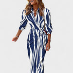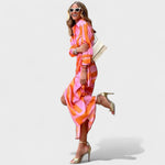 Живописна дълга рокля, която завладява с всяка стъпка, е истински шедьовър на елегантността. С риза-крой и елегантна яка, тази рокля е изработена от лека и податлива тъкан, която красиво пада и създава флуидна силуета с изискан разрез. Дискретно подчертава такава талия и осигурява свобода на движението, правейки я идеална както за дневни комбинации, така и за вечерни поводи.