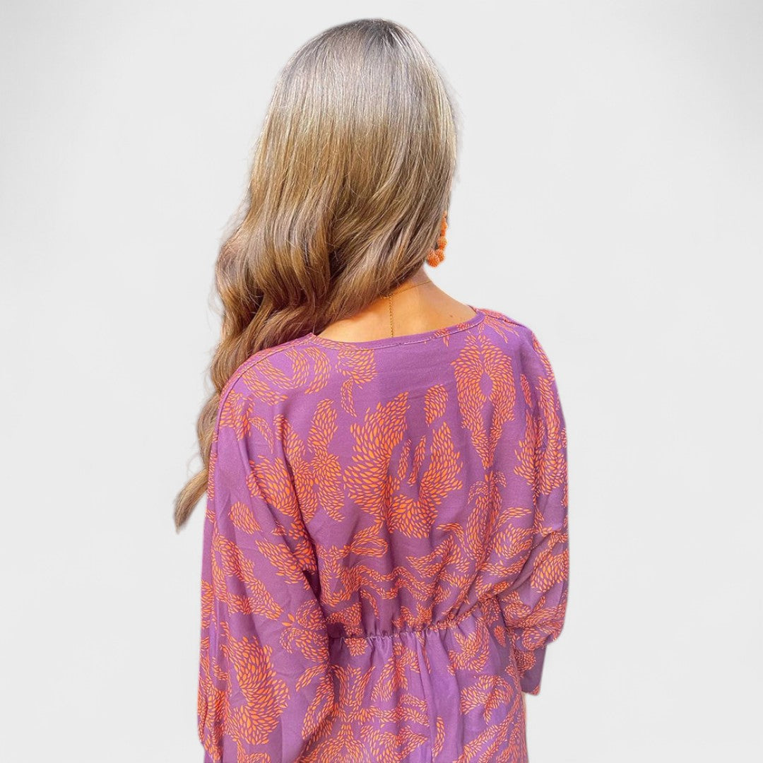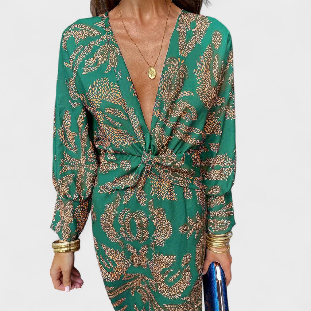 Detalles que elevan tu estilo: изискано V-образно деколте, дълги ръкави, ефирен материал, привлекателна шарка.