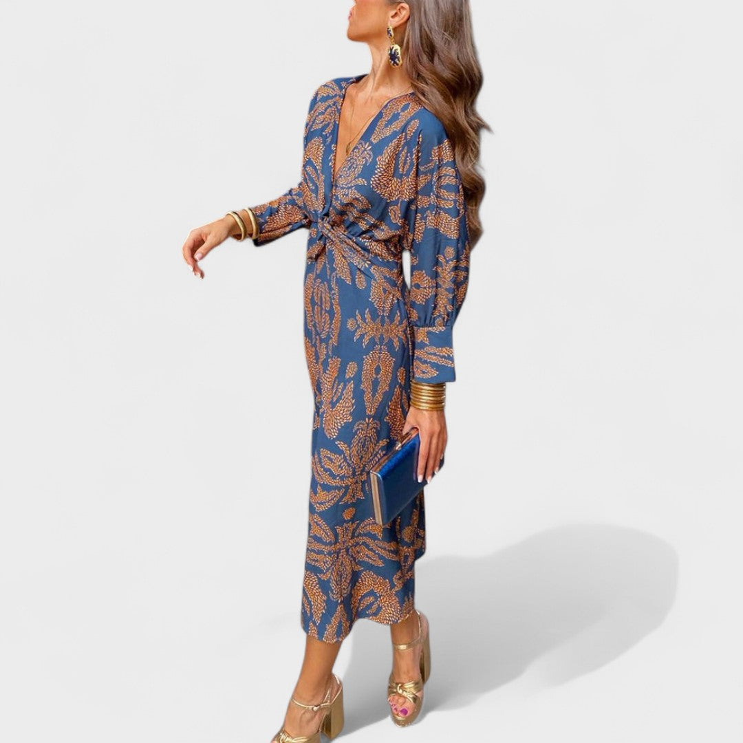 Тази елегантна максиля с шарка е създадена рока, за да подчертаете вашата женственост и стил. С красивата си шарка и преливащата кройка, тя обгръща тялото с нежност и изящество. Дългите ръкави и дълбокото V-образно деколте ì придават изискан вид, а ефирният материал осигурява лекота и комфорт, което е идеално за всякакви поводи.
