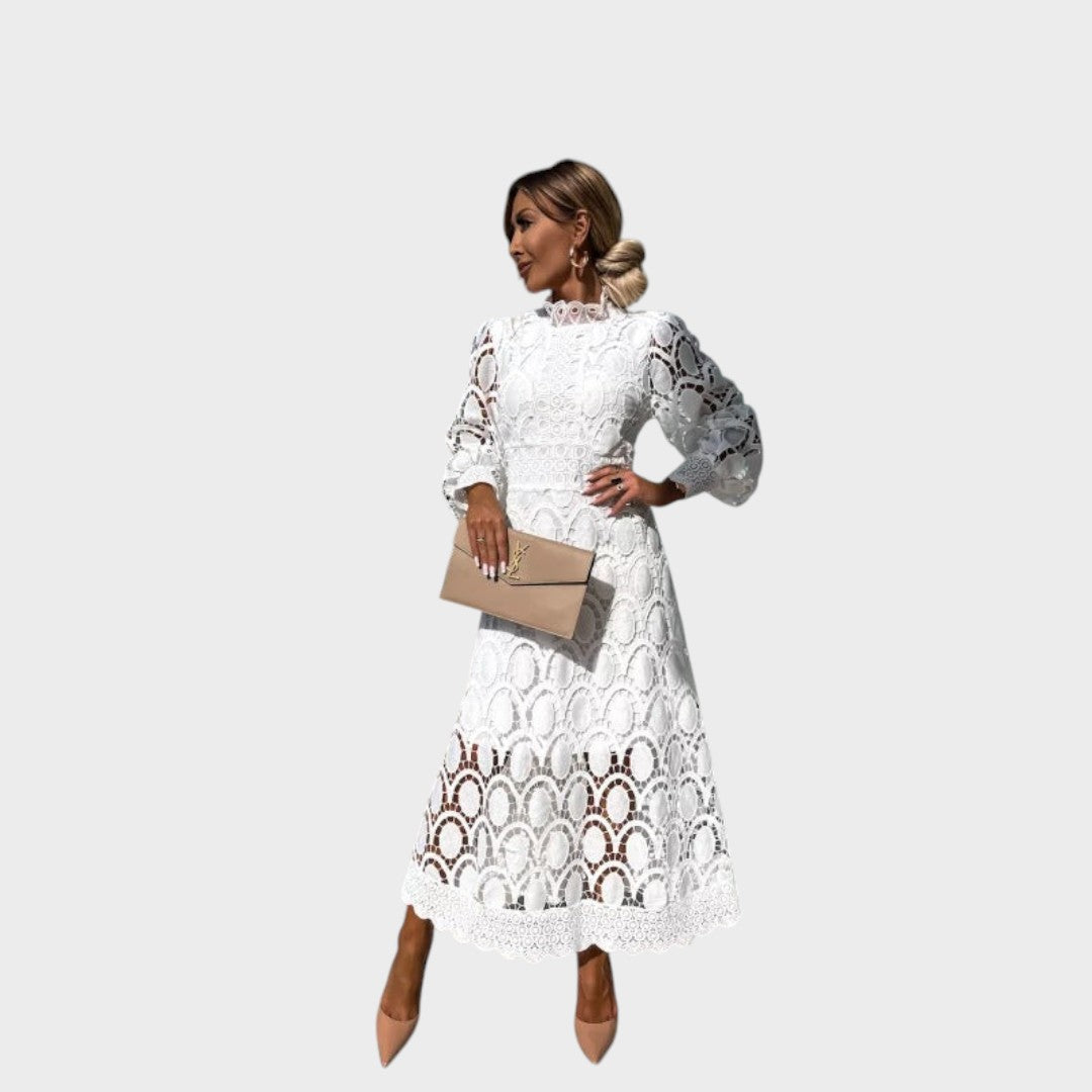 Надежда - Чипкана рокля с обемни ръкави и висока яка