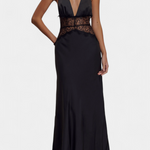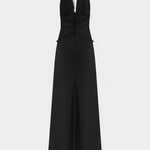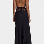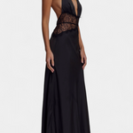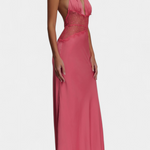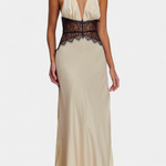 Детайли, които увеличават вашия стил: дълбок халтер изрез, полупрозрачна чипка на талията, дълга течна пола с естествен пад, дизайн без гръб.