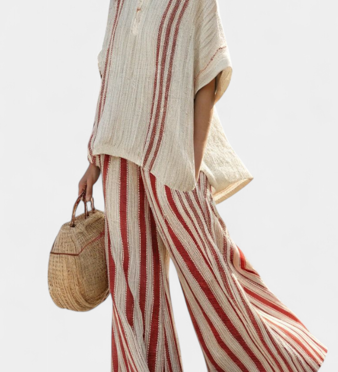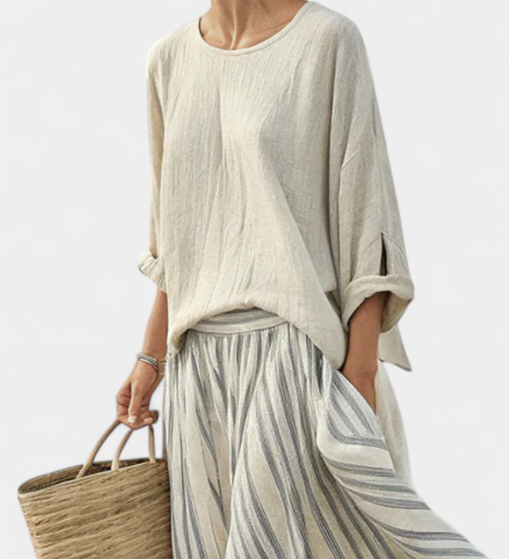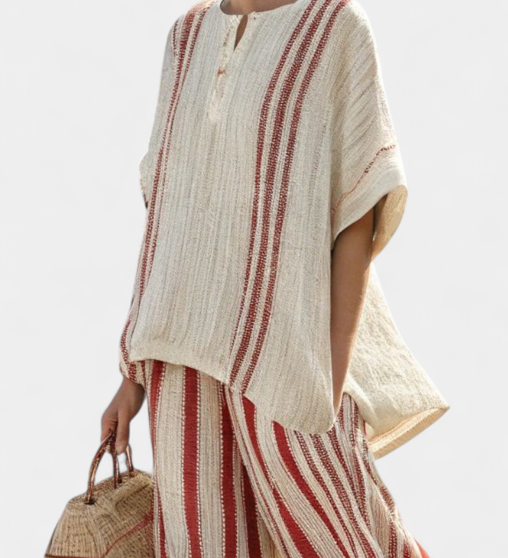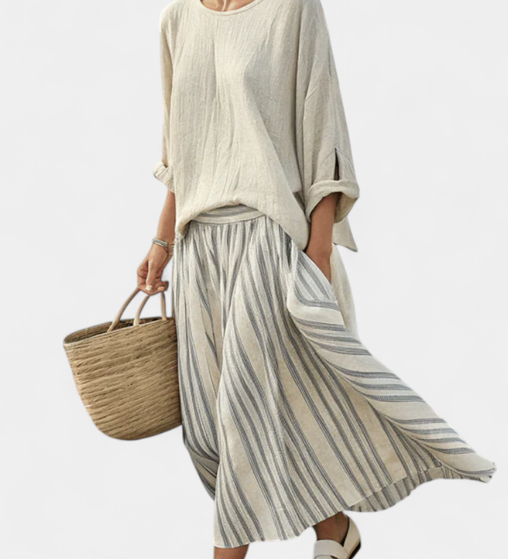 Радостина - Цялостен комплект Daisy с Oversize тениска и миди пола с райета от лен и бамбук за елегантен и удобен стил