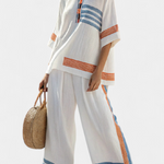 Комплектът Daisy предлага структурирана свежест с морско усещане . С чист и модерен дизайн, обогатен с ръчно изработени детайли в ярки цветове, той съчетава стил и комфорт. Широката тениска и панталоните с широки крачоли създават разкрепостен силует, който предава лекарството и индивидуалност, идеален за почивка на море или артистични разходки.