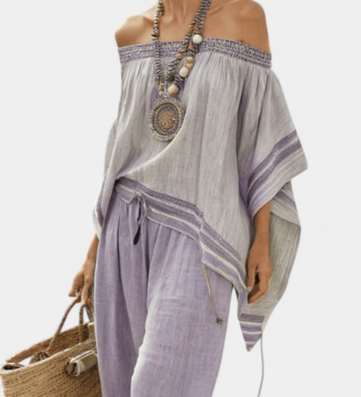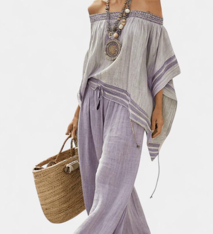Десислава - Бамбукова блузка с райета, с открити рамена и широки панталони за елегантен и свеж стил