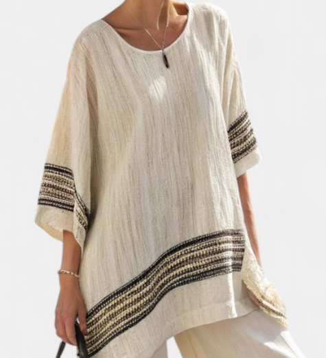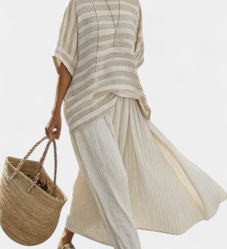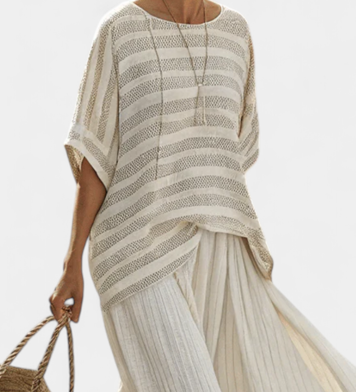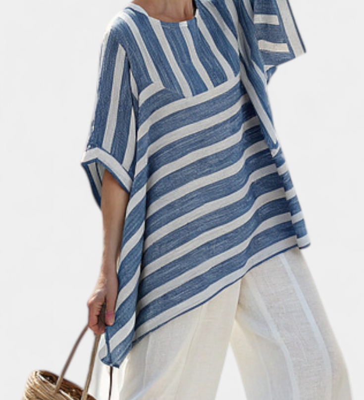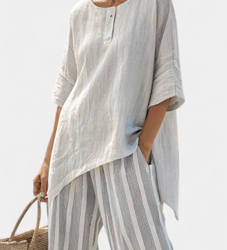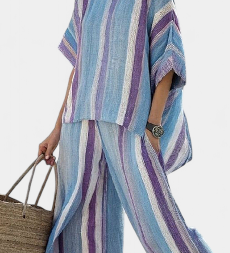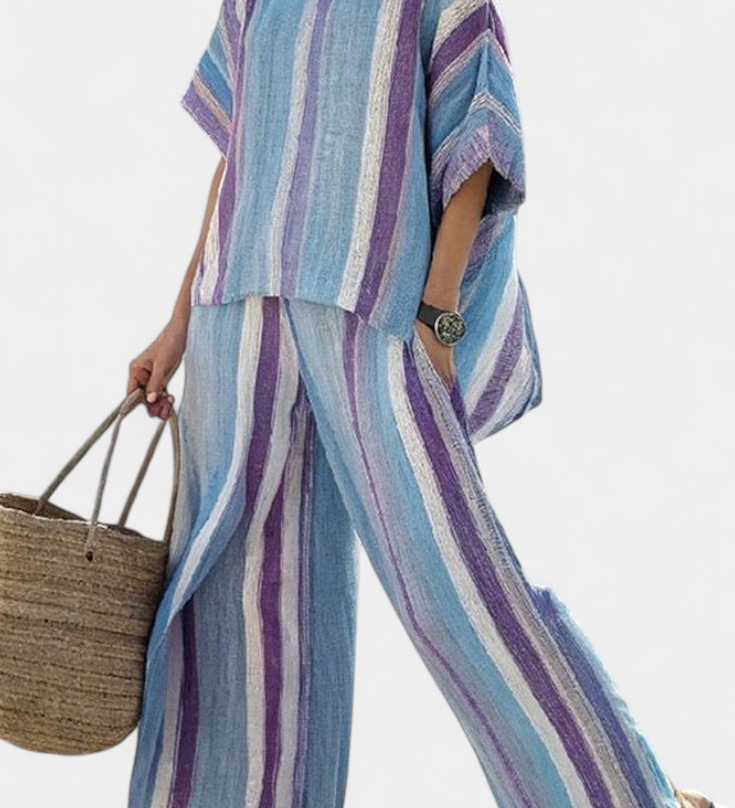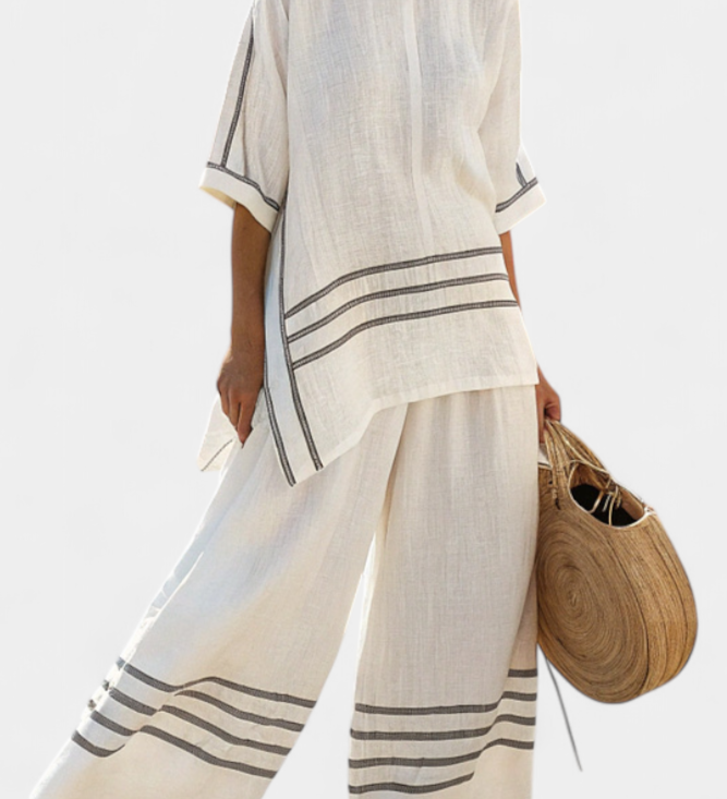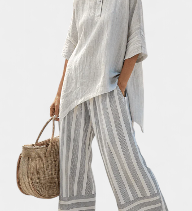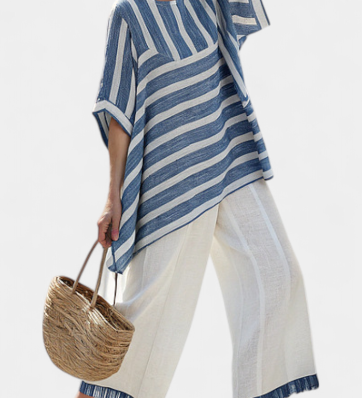 Даниела - Елегантен комплект от лен и бамбук с райета и асиметрична блуза и широки панталони за изтънчен стил