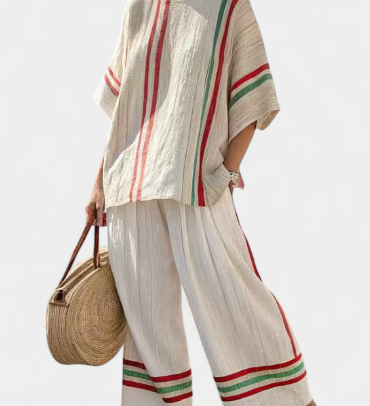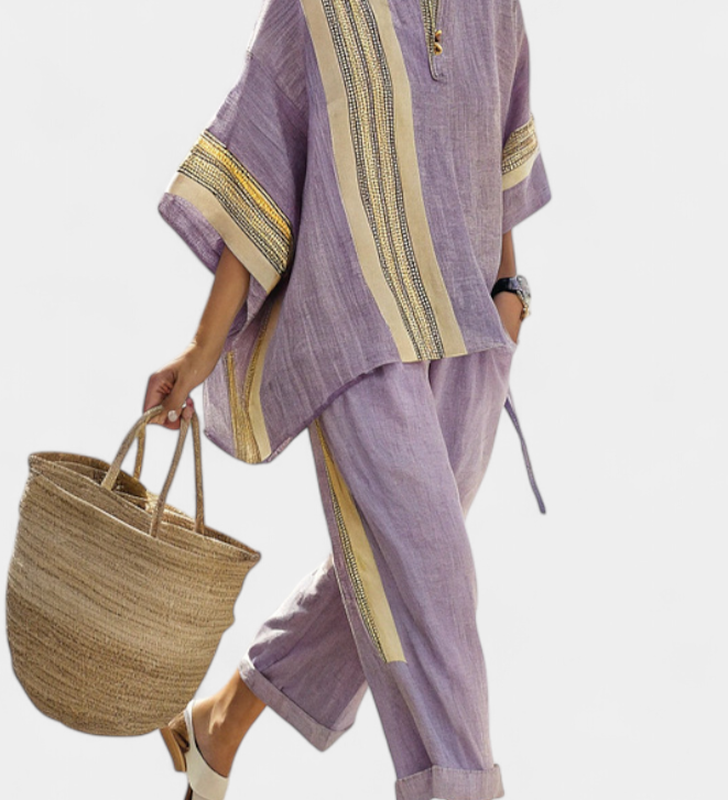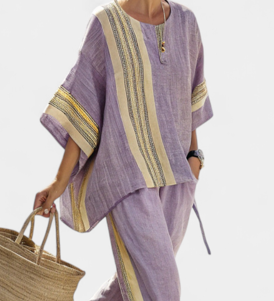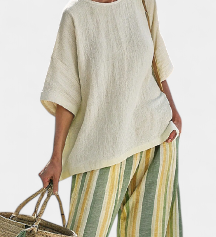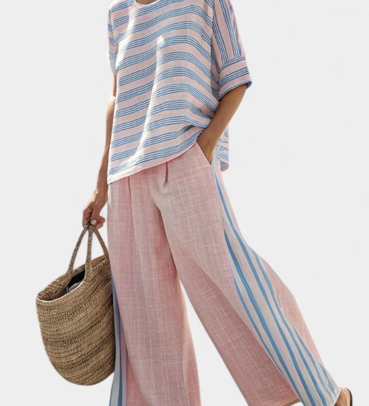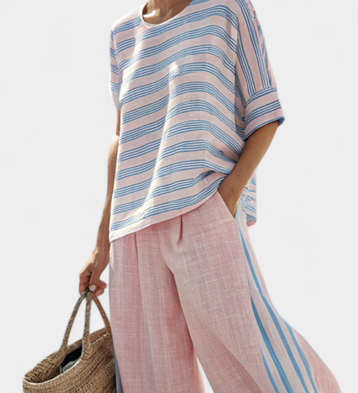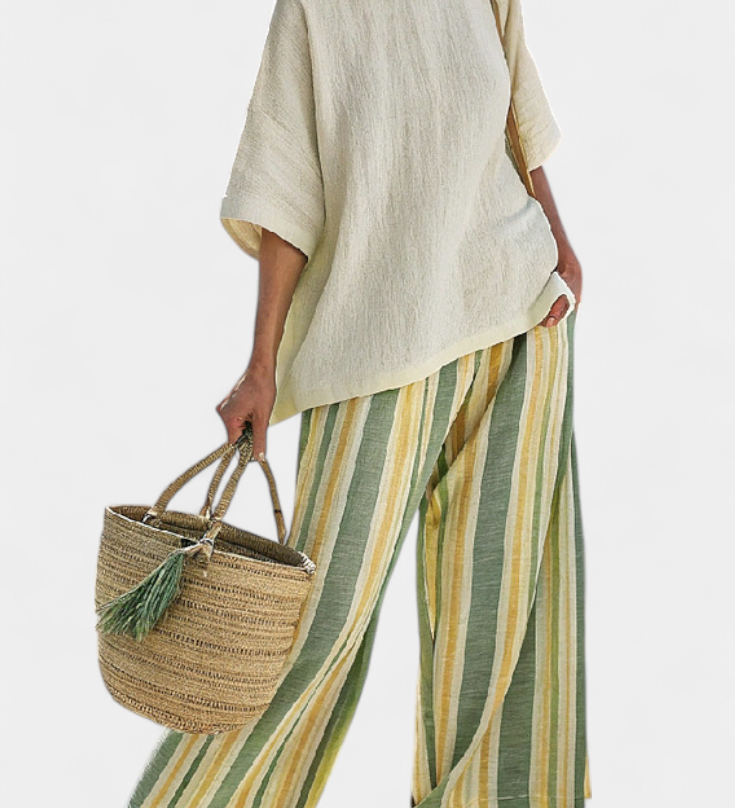 Елена - Комплект от ленен бамбук Дейзи с елегантна райета тениска и летящи панталони за модерен и удобен стил
