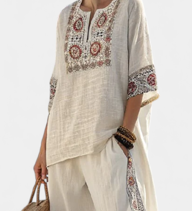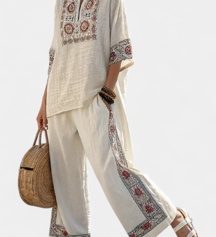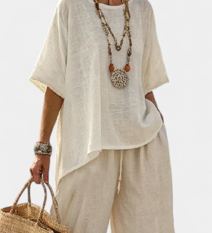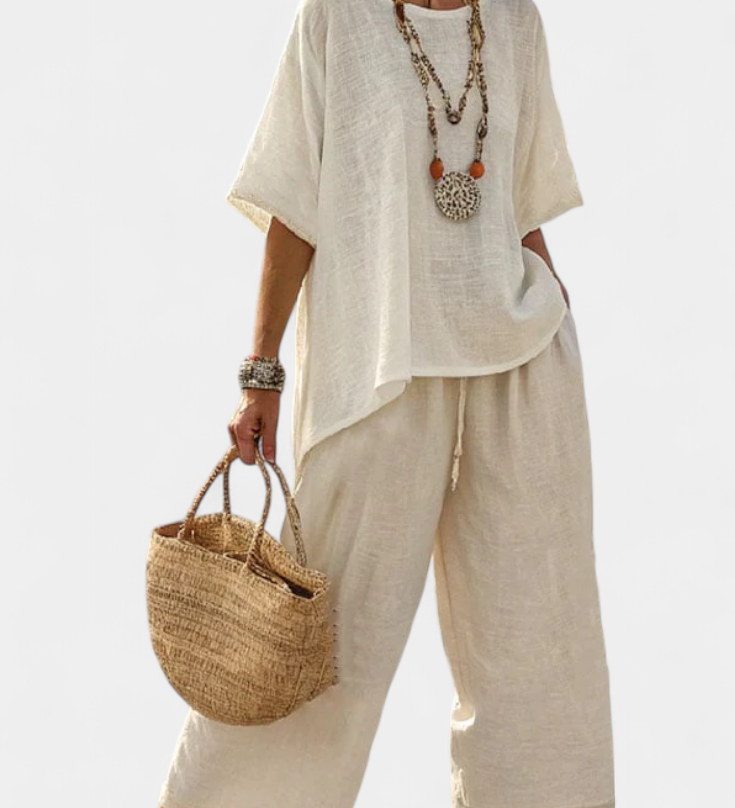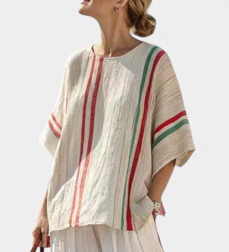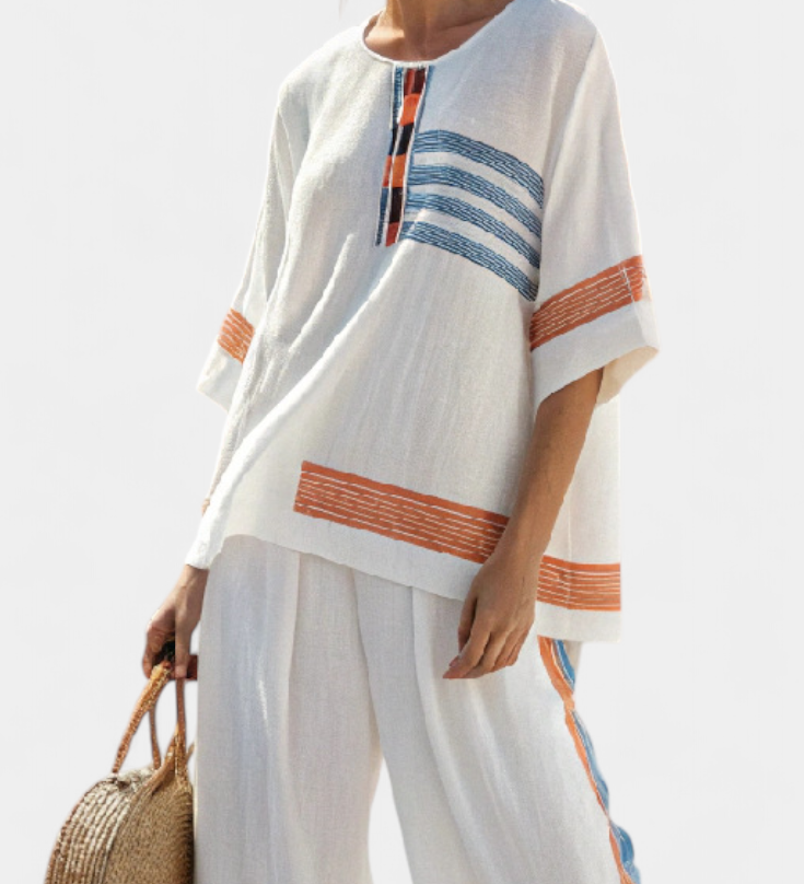 Елена - Комплект от ленен бамбук Дейзи с елегантна райета тениска и летящи панталони за модерен и удобен стил
