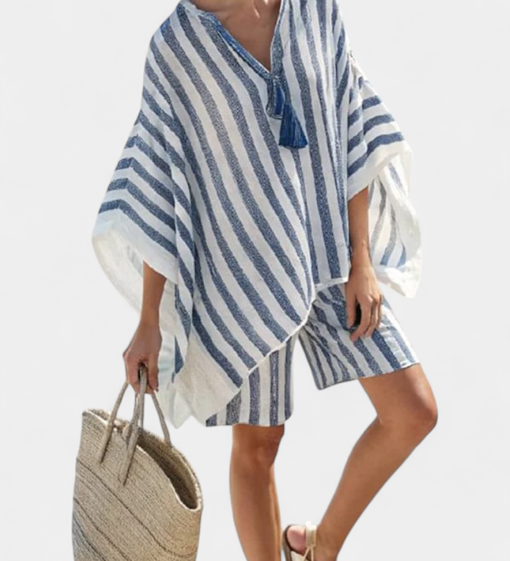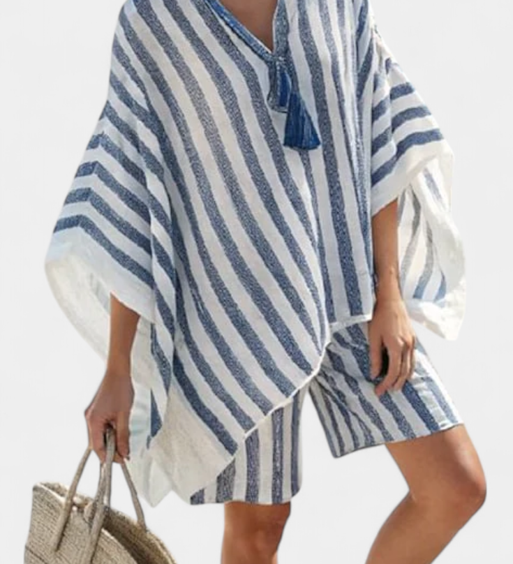 Гергана - Комплект Дейзи от бамбуков лен Средиземно море с маслинени райета за освежаващ и елегантен стил