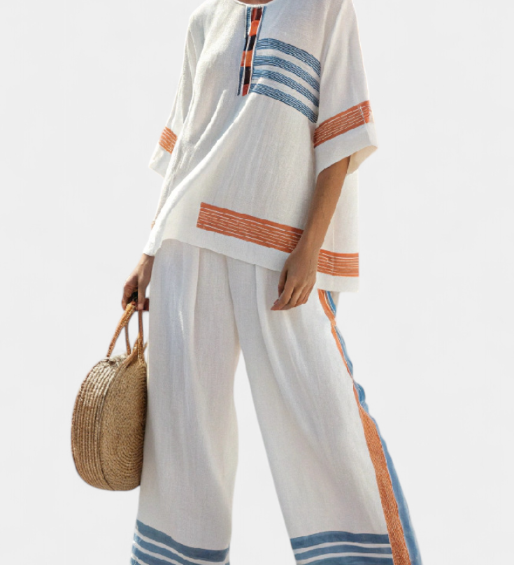 Десислава - Средиземноморски Комплект от Лен със Сини Ленти и Панталони с Ластик за Свеж и Елегантен Вид