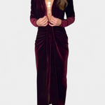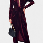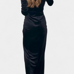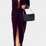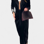Очарователна силуетка, която съчетава сексуалност и вечна елегантност. Вилма се отличава с дълбок V-изрез, който удължава фигурата, дълги ръкави, които балансират дизайна, и преден разрез, който добавя динамика и смелост. Златният завършек усилва нейния магнитен характер, правейки я парче, замислено да блести на всяка възможност.