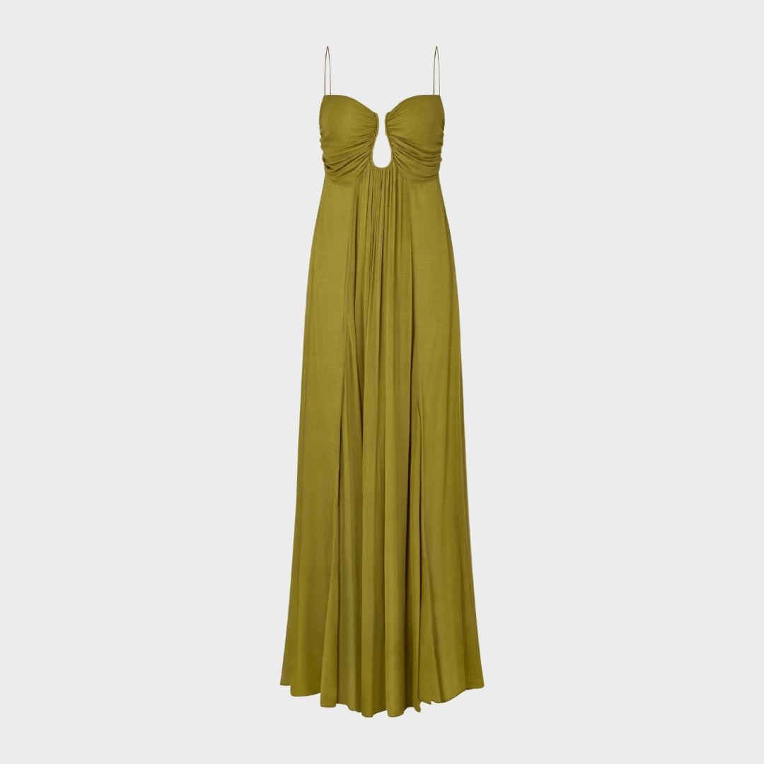 Тази макси рокля предлага елегантен силует с удобен материал, който нежно обгръща тялото. Ключовият детайл с дупка добавя фин чар, правейки я перфектен избор за всякакви поводи - от дневни срещи до вечерни излизания.