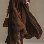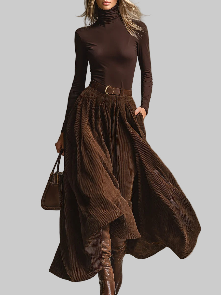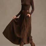 Безвременен стил и елегантност без усилие. Комплектът от две части Aveline съчетава мек и прилепнал долче вита с широка и плавна макси пола, създавайки балансирана и женствена силуета. Подчертаната талия и движението на полата подчертават формите, без да се жертва комфорта: идеален за градски дни, офис или изискано вечеря. Разпродажба за Черен петък: специални цени за ограничен период. Ограничени наличности.