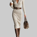 Този елегантен чиф Midi форма е създаден, за да подчертае вашия силует с изискана простота. Меката и еластична материя обгръща тялото, осигурявайки комфорт през целия ден, независимо дали сте в офиса или на вечерно излизане. Полувисокото V-образно деколте и дългите ръкави добавят завършен вид, който е идеален за всякакви поводи. Midi дължината прави тоалета лесен за комбиниране с токчета, ботуши или обувки за разнообразни визии.