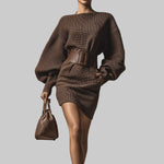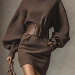 Lunori™ Cléa | Къса рокля от трико с колан подчертава формите с модерен, но вечен силует. Мекото трико обгръща тялото с прилепнала кройка, докато структурният колан дефинира талията, създавайки елегантен скулптурен ефект. Дългите ръкави добавят щрих на висша мода, а мини дължината придава женственост и увереност — перфектна за вечери, специални поводи или изискани визии в града.