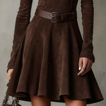 Мини рокля от винтидж замша, която съчетава класическия чар с модерен щрих. Мекото синтетично замшево покритие и високият топъл яка създават изтънчен, но лесен за носене вид, докато свободната кройка предлага комфорт през целия ден. Мини дължината придава млада и женствена енергия, идеална за съчетаване с чорапогащи и ботуши в по-хладните сезони.