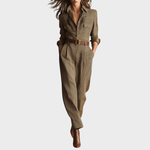 Този гащеризон е вашият ключ към моментната елегантност, който ще направите център за внимание. Със своята изискана и вталена кройка, той съчетава стил и практичност, позволявайки ви да изглеждате невероятно без усилие. Дизайнът му е вдъхновен от работната визия, но с елегантни детайли, които подчертават женствеността.