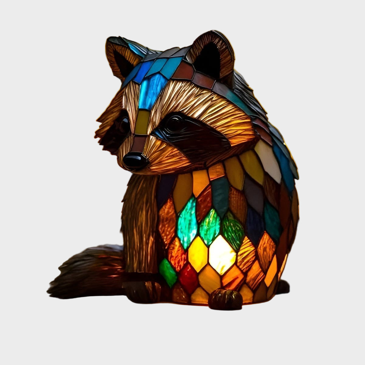 Тази лампа с енот улавя игривия дух на гората в ярък витражен дизайн. Тя не само добавя забавен акцент към вашето пространство, но и служи като топъл, уютен източник на светлина, който създава атмосфера на комфорт и спокойствие.