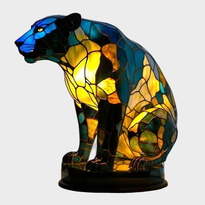 Изящна, мощна и загадъчна—тази лампа с пантера излъчва смела светлина през дълбоките си сини и златисти тонове. Тя не е просто лампа, а декоративен елемент, който въплъщава грация и интензивност, придавайки уникален стил на всяко пространство.