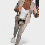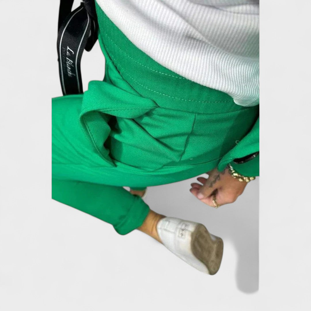 Този индивидуално персонализиран комплект с меко сако и свободни спортни панталони предлага модерен и удобен стил, който е перфектен за ежедневно носене или неформални срещи. Зеленият комплект с модерни детайли осигурява изключителен стил и комфорт през целия ден.
